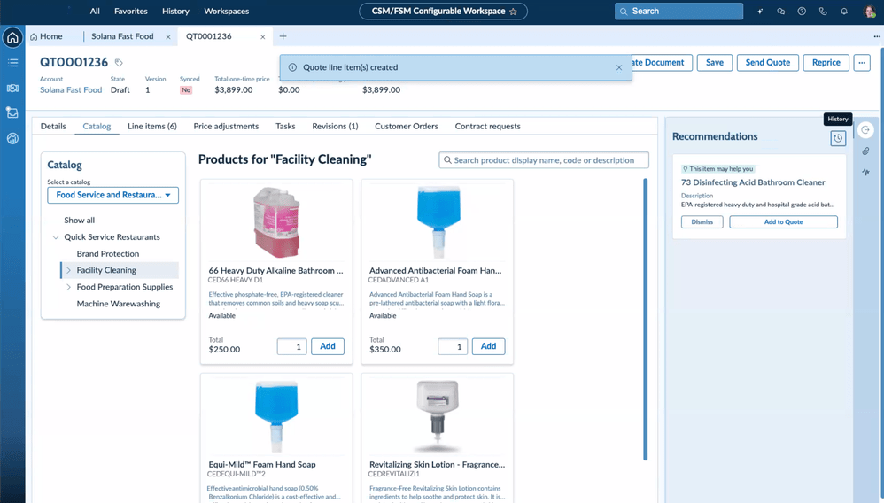 Guided selling and AI assistance: SOM also transforms the effectiveness of sales operations by embedding intelligence into the process. For instance, when a sales agent is configuring a quote for a customer, the system can suggest relevant add-on products or services. This is accomplished through contextual product recommendations – an AI-driven feature that looks at the current quote contents (or similar customers’ purchase history) and recommends items to upsell. This guided selling approach not only can increase deal size (benefiting revenue) but also helps new sales reps ramp up faster, since the system guides them on what to offer. In the screenshot below, you can see an example of SOM’s agent workspace showing a product catalog for “Facility Cleaning” products and, on the right side, a Recommendations panel suggesting an additional item to add to the quote (e.g., a disinfecting cleaner that “may help you”). These kinds of features streamline decision-making and ensure no sales opportunity is missed.